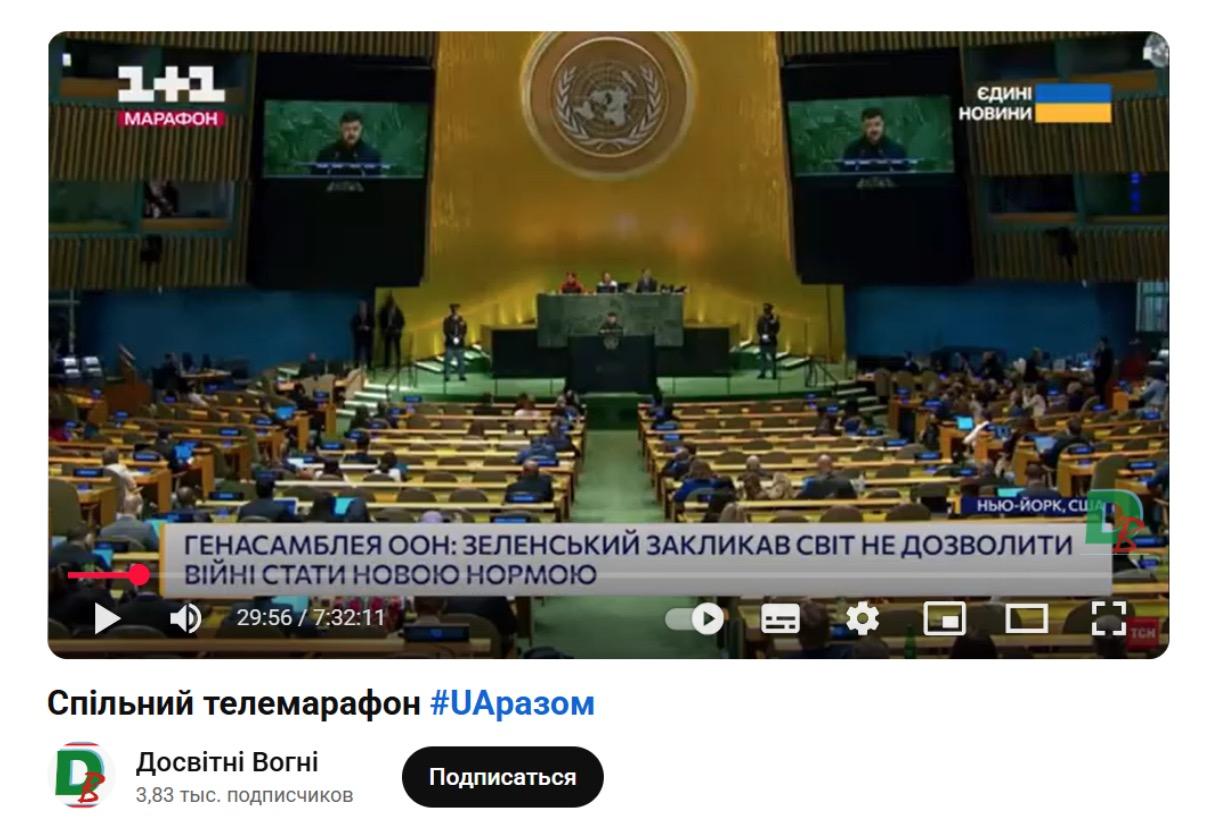 Каманда WTF знайшла запіс наўпроставай трансляцыі выступу Зяленскага ў тэлемарафоне за 24 верасня. На відэа — тыя ж лагатыпы каналу, тая ж зала, толькі выглядае інакш: у ёй шмат вольных месцаў. 25 верасня ў тэлемарафоне сюжэт з выступам Зяленскага паказалі зноў, у залі ўсё гэтак жа былі пустыя месцы.