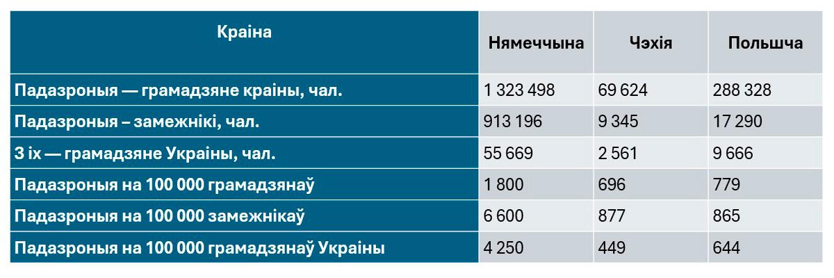 У Польшчы, Чэхіі і Нямеччыне, дзе жыве найбольшая колькасць перасяленцаў з Украіны, статыстыка паказвае: у адных выпадках іх доля крыху вышэй, у іншых — ніжэй, чым сярод мясцовых жыхароў.