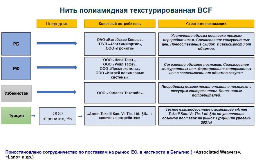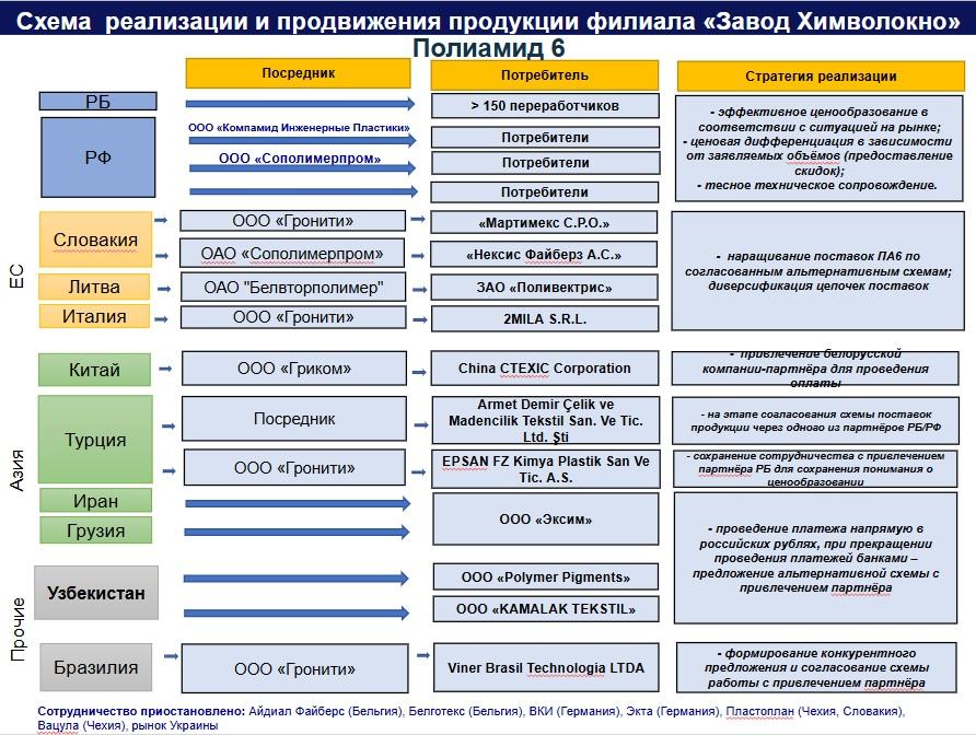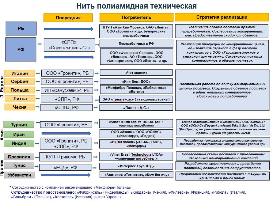 З дакументацыі аддзелу маркетынгу беларускага прадпрыемства вынікае, што «Завод Хімвалакно» яшчэ ў 2022 годзе быў ледзь не адзіным замежным пастаўшчыком поліаміднай тэхнічнай ніці ў Расею з Еўразійскага эканамічнага саюзу (ЕАЭС): на яго прыпадала 99-100% экспарту. [*] На момант выхаду расследавання з’явіліся канкурэнты з Арменіі і Казахстану, але пастаўкі з Беларусі пераважаюць.