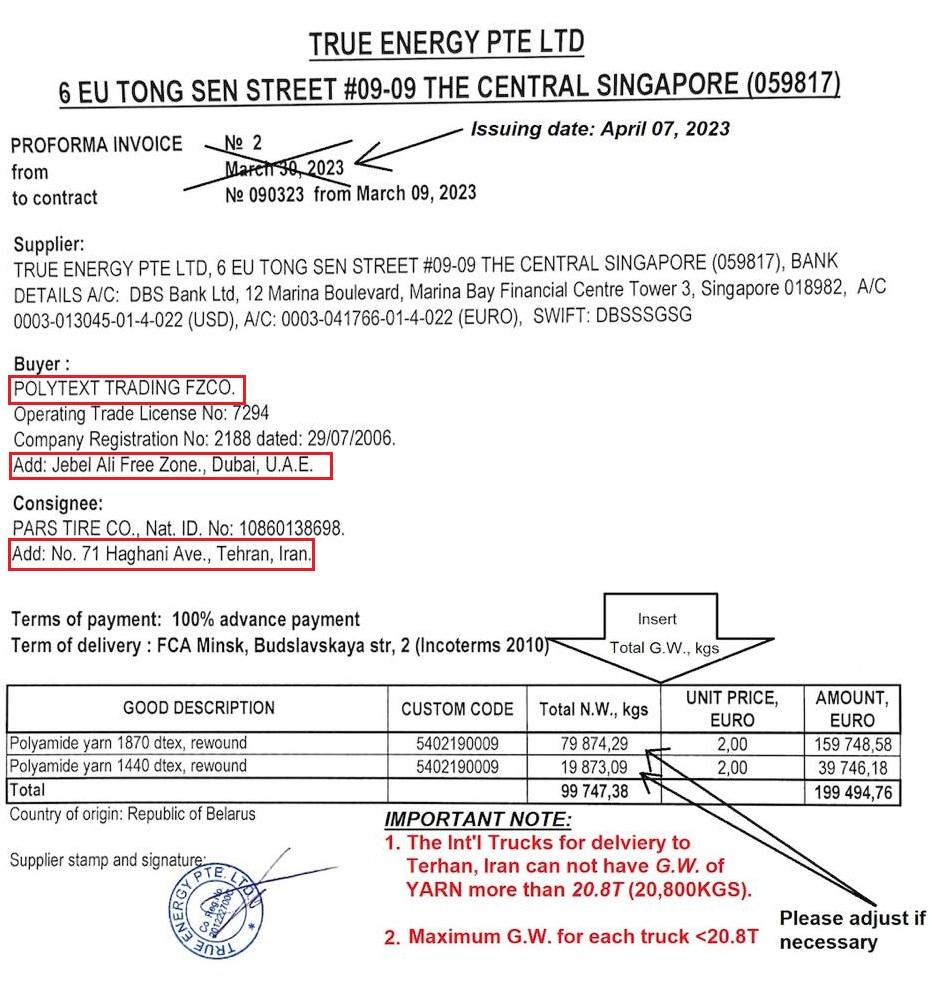 Бакі дамовіліся аб пастаўцы нітак з «Гродна Азот». Фармальным прадаўцом стала сінгапурская фірма True Energy PTE. LTD, але адпраўлялі тавар з адрасу, дзе зарэгістравана аднайменнае беларускае ТАА «Сапраўдная Энергія» і «Ар-бел камодытэс», што належыць Карасцялёву. [*] [*] На паперы тавар купіла фірма, зарэгістраваная ў Арабскіх Эміратах, але адрас дастаўкі — Тэгеран. [*]