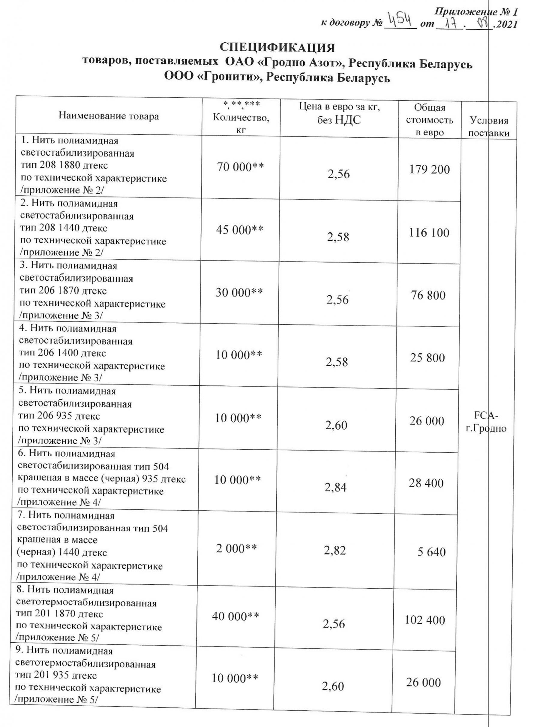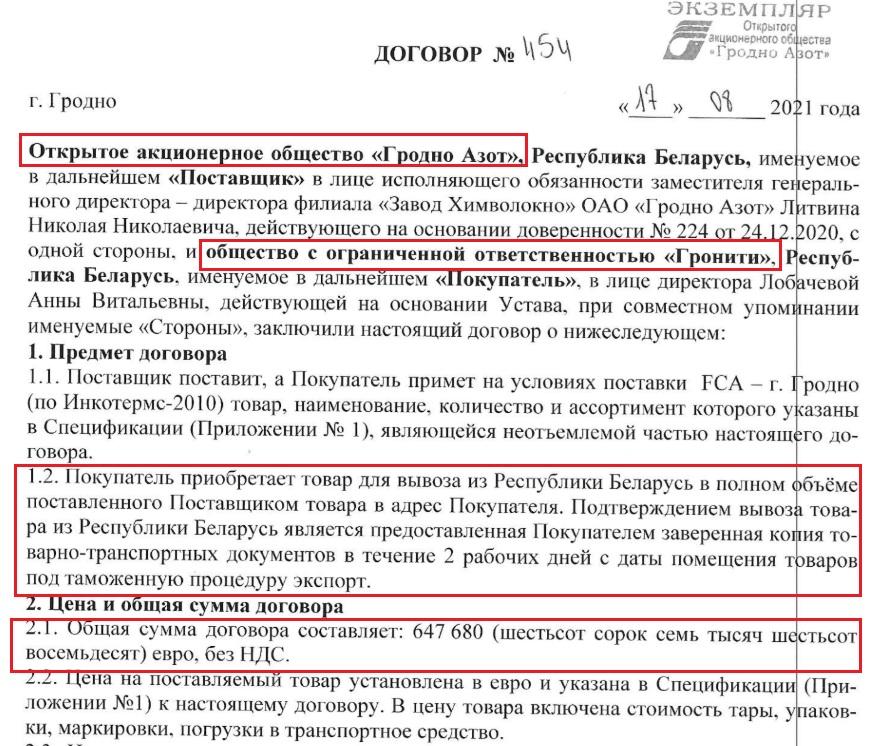 Ролю «Гроніці» ў пастаўках забароненай прадукцыі ў ЕЗ пацвярджае дакумент, які БРЦ атрымаў ад «Рабочага руху». Кампанія падпісала з «Гродна Азотам» дамову №454 у жніўні 2021 года «для вывазу з Беларусі ў поўным памеры» поліаміднай ніткі на амаль €650 тыс. [*] [*] [*] Пасля гэты дакумент абнаўлялі і пашыралі спіс прадукцыі на вываз. [*]