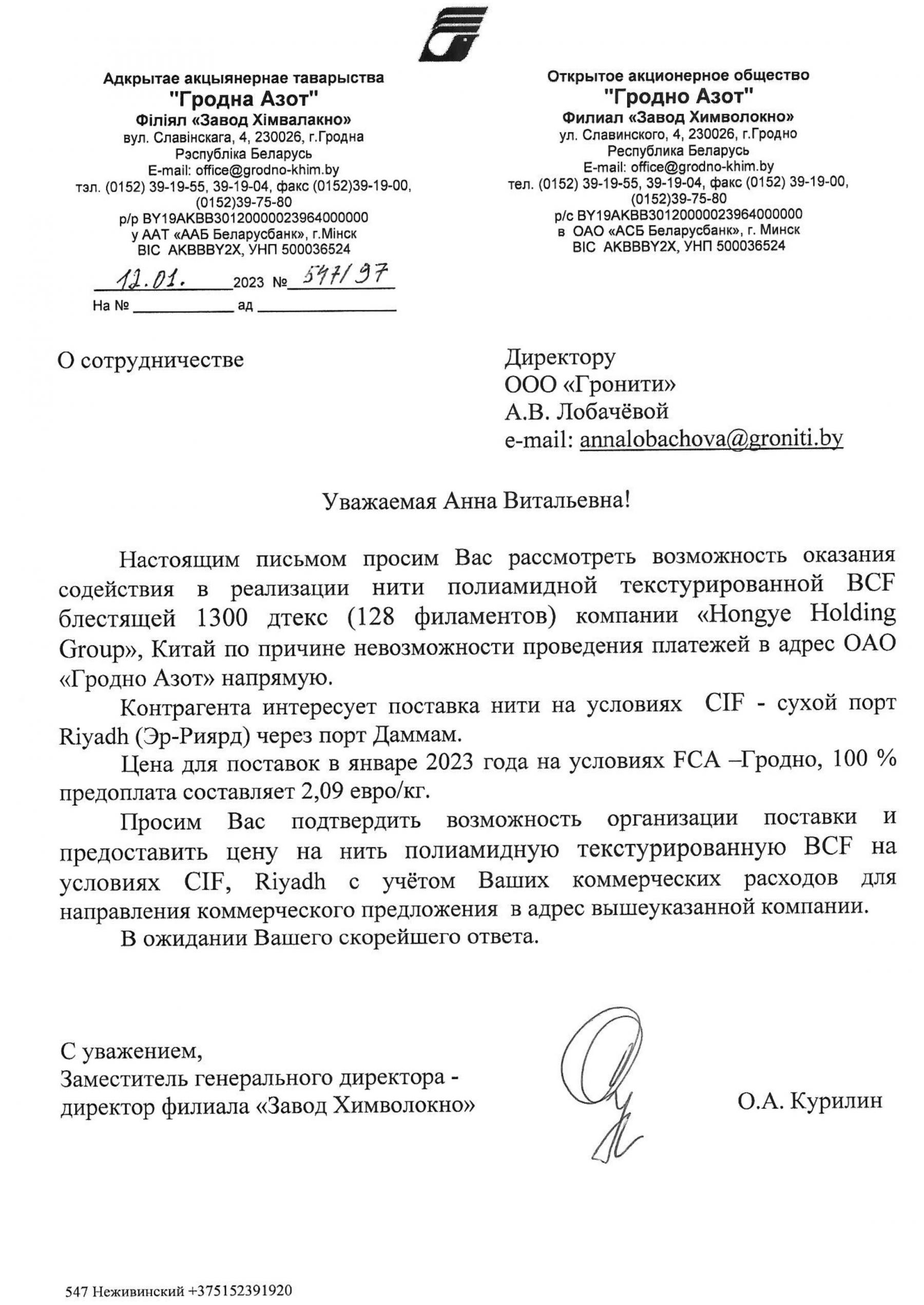 Падсанкцыйнае дзяржпрадпрыемства дало афіцыйны дазвол змяняць паходжанне свайго тавару пры продажы яго ў Еўразвяз. Пра гэта мы даведаліся з ліставання прадстаўнікоў абедзвюх фірмаў. Напрыканцы лістапада 2021-га, за два дні да пачатку дзеяння ўжо еўрапейскіх санкцый, выконваючы абавязкі намесніка дырэктара філіялу «Завод Хiмвалакно» Федар Сарокін напісаў дырэктарцы «Гроніці» Ганне Лабачовай, што прадпрыемства не мае нічога супраць, «каб пры афармленні экспартнай мытнай дэкларацыі ад імя ТАА “Гроніці”, у якасці вытворцы ўказвалі ТАА “Гроніці”». Дадзенае ўзгадненне павінны былі прымяняць для паставак прадукцыі заводу ў Літву. [*]