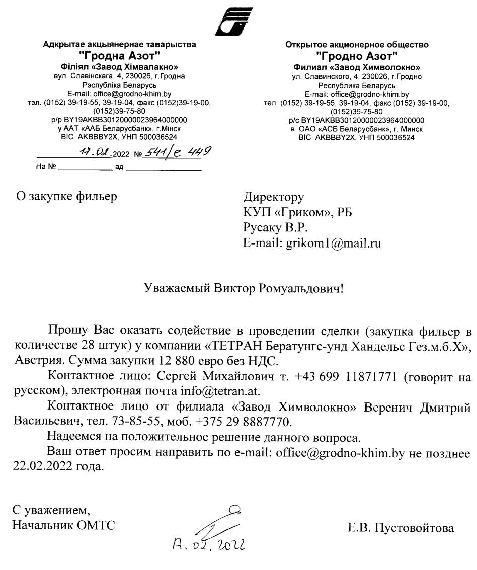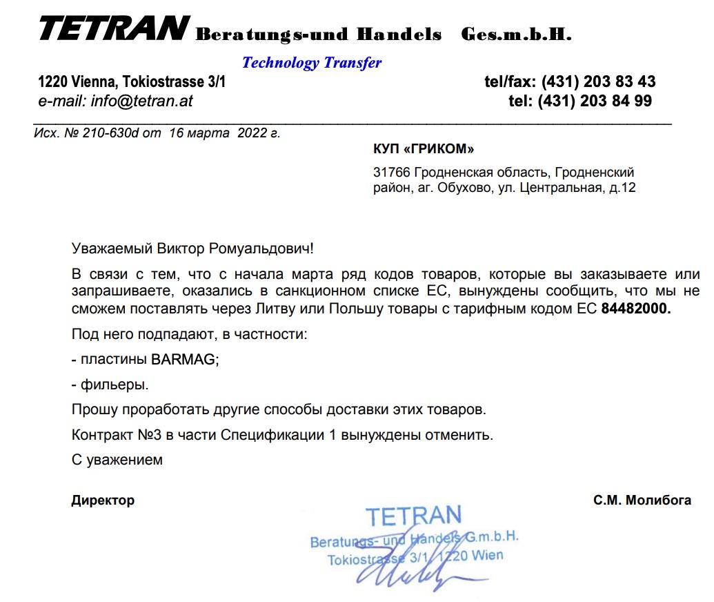 Пасярэднік накіраваў запыт у Tetran. Адказ на яго прыйшоў у сакавіку, калі ўжо пачалася поўнамаштабная вайна Расеі супраць Украіны і ЕЗ увёў санкцыі супраць Беларусі як саюзніцы агрэсара. Еўрапейскім кампаніям забаранілі пастаўляць такое абсталяванне не толькі «Гродна Азоту», але і ўвогуле ў Беларусь. Імаверна таму ўласнік Tetran Сяргей Малібога адмовіўся прадаваць дэталі. Аднак фармулёўкі ў ягоным лісце выглядалі як намёк на магчымасць абыходу абмежаванняў: «Вымушаны паведаміць, што мы не зможам пастаўляць праз Літву і Польшчу тавары з тарыфным кодам 84482000. <...> Прашу прапрацаваць іншыя спосабы дастаўкі гэтых тавараў». [*]