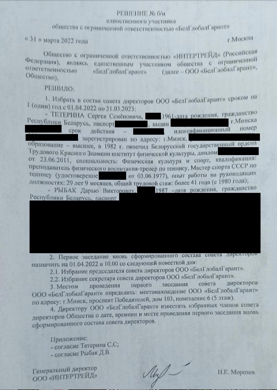 BelGlobalGarant is the brainchild of Aleksandr Lukashenko’s personal tennis coach and “wallet”, Sergei Teterin. In June 2021, the EU imposed personal sanctions against him. Teterin had resigned from BelGlobalGarant’s founding board a few weeks earlier, thus helping the company avoid European restrictions. [*] [*] However, the company created a new management body — the board of directors — in the spring of next year. [*] Almost immediately, Sergei Teterin joined it, retaining his influence on the company’s activities. [*] [*] [*] [*] All drivers, including those from European countries that have imposed sanctions on Lukashenko’s “wallet”, now pay a fee to travel across the Belarusian border to this company.