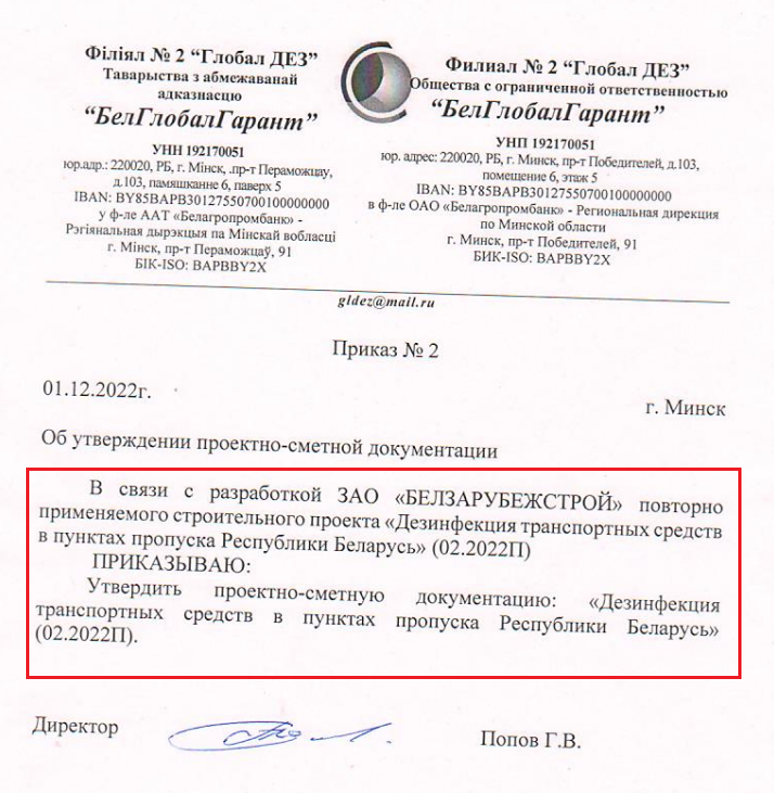 ZAT Belzamezhbud (a closed joint stock company as defined by the law of Belarus), renamed ZAT ViaSETrade (a closed joint stock company as defined by the law of Belarus) in 2022, also joined the construction of the BelGlobalGarant disinfection stations. [*] From at least 2007 to 2022, this campaign was linked to Victor Chevtsov, a businessman close to the Belarusian authorities. In the summer of 2024, after the BIC investigation revealed his monopoly on the manufacture of protective holograms, he was sanctioned by the European Union and Switzerland for receiving “benefits from the Lukashenko regime”. He controlled the company through his ZAT Bank Rashenne (a closed joint stock company as defined by the law of Belarus). Belzamezhbud was supposed to design a project for disinfection stations.