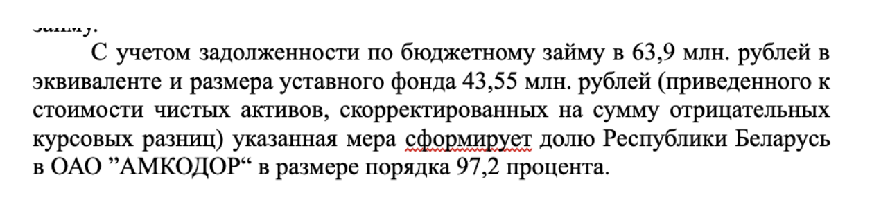 Вернуть займ государству помогло само государство. Специальным указом Лукашенко, под предлогом «стабилизации финансового состояния» предприятия, «Амкодору» выдали из беларусского бюджета новый займ на $44,5 млн, чтобы погасить остаток долга. Процент по кредиту снизили с 7% до 5% годовых — почти вдвое ниже инфляции, то есть займ предоставили на льготных условиях. [*] Но на этот раз его выдали вместе со страховкой для государства: гарантией возврата займа выступили акции ОАО «Амкодор» — управляющая компания холдинга. Согласно договору, если в 2026 году предприятие не сможет рассчитаться по этому займу, холдинг, состоящий из 29 компаний с разной долей собственности, перейдет под государственный контроль. [*]