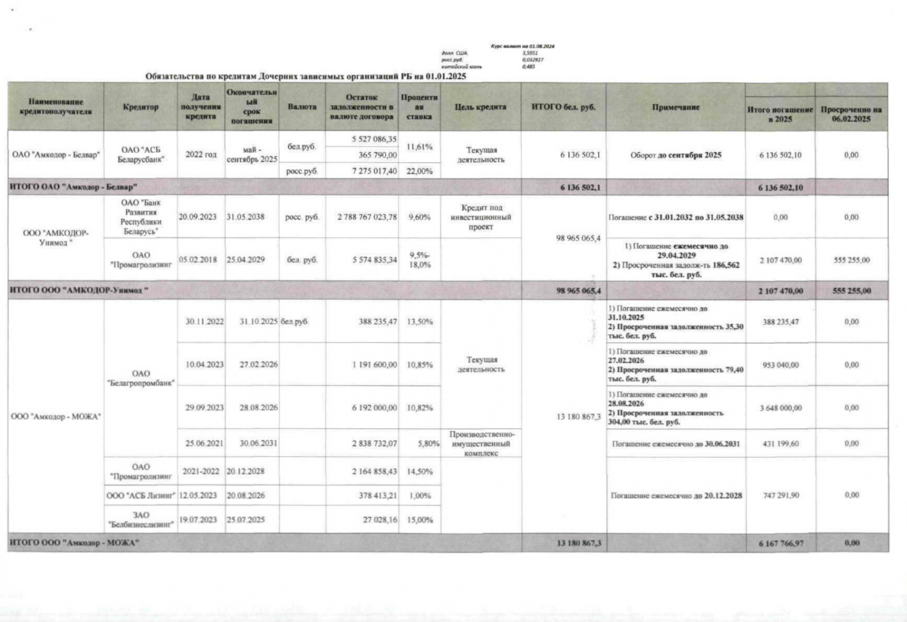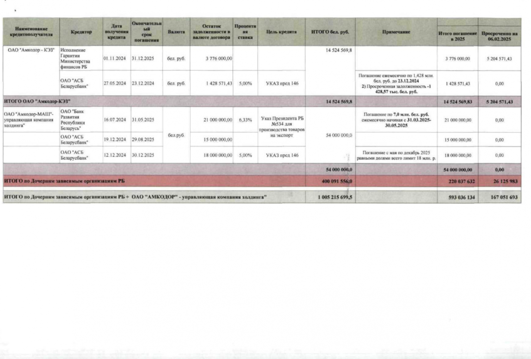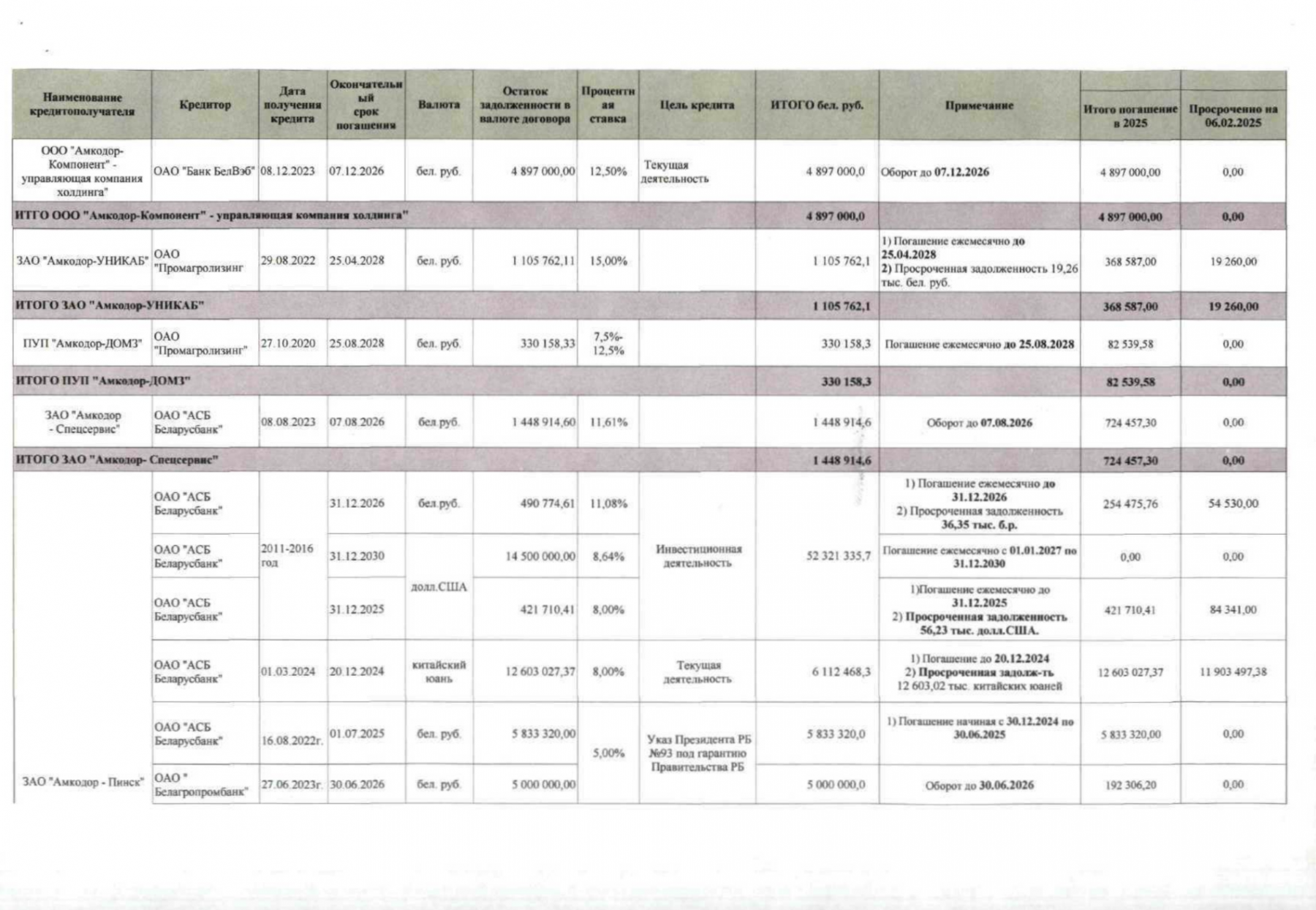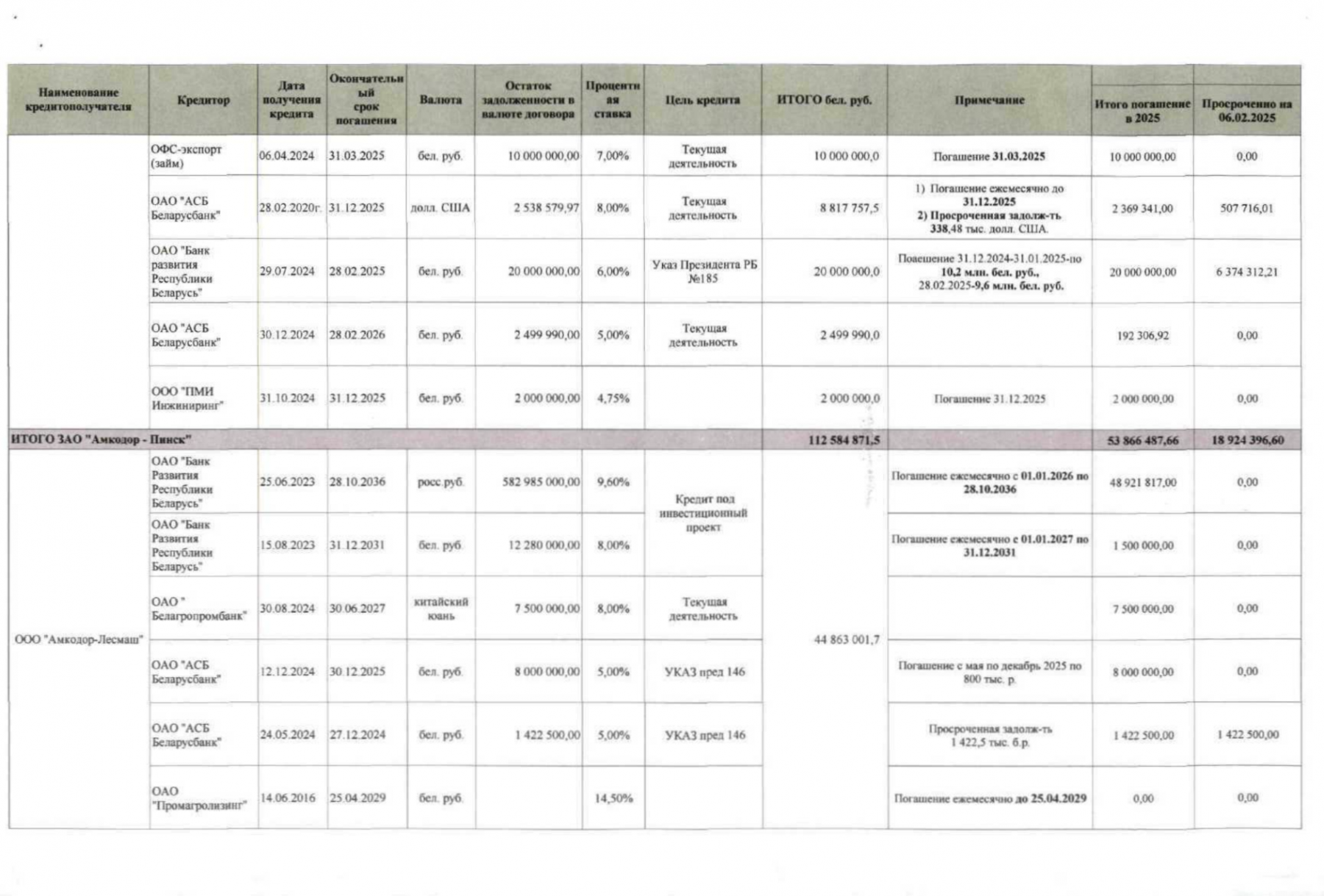 Слабые финансовые показатели и высокая задолженность предприятий, перешедших под контроль государства, вынудили чиновников в октябре 2025 года разработать срочный план спасения — документ, согласно которому первым шагом стала выдача «Амкодору» из бюджета очередного займа в 250 млн рублей ($83 млн на момент составления плана). Там же был представлен поэтапный график погашения всех долгов холдинга, растянутый более чем на полвека — до 2087 года. При этом чиновники заложили в прогноз на ближайшие 60 лет стабильный ежегодный рост продаж техники «Амкодора». То есть расчет строился на том, что за это время предприятия холдинга не столкнутся ни с одним кризисом или спадом продаж.