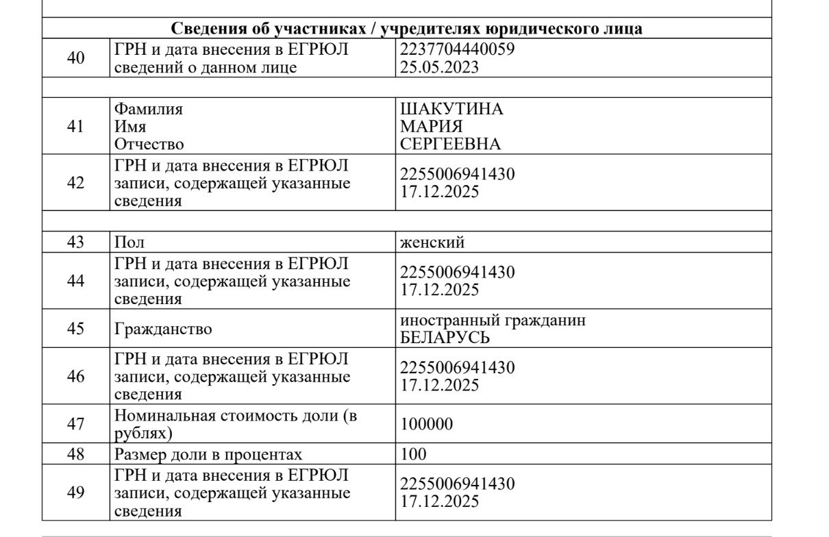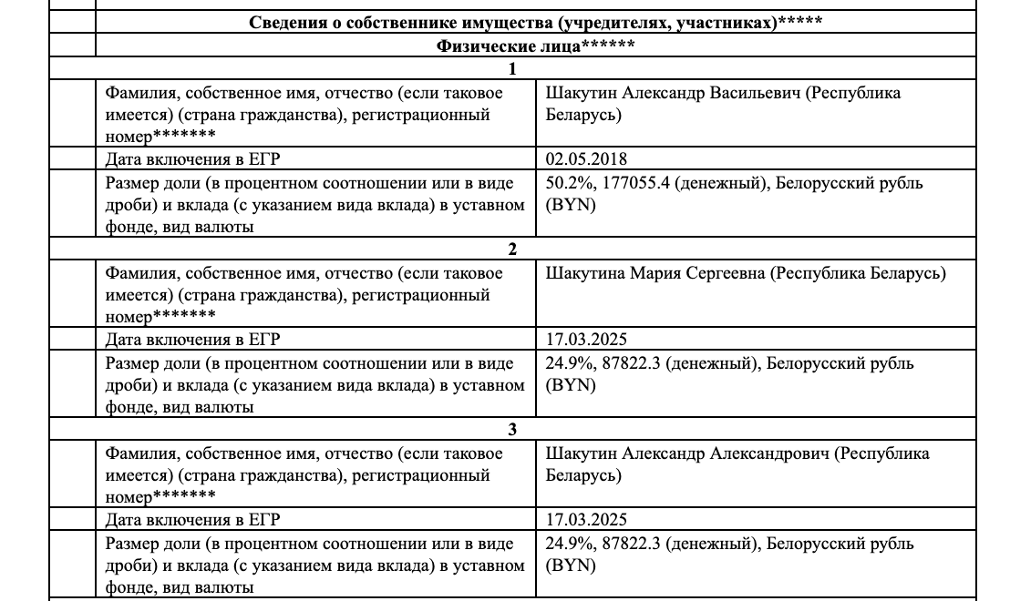 Передача акций в 2025 году не поставила точку в переделе империи Шакутина. В начале того же года он переписал доли в своих беларусских компаниях на жену и сына — что может свидетельствовать о попытке вывести эти активы из-под возможных финансовых претензий государства. [*] [*] [*] [*]