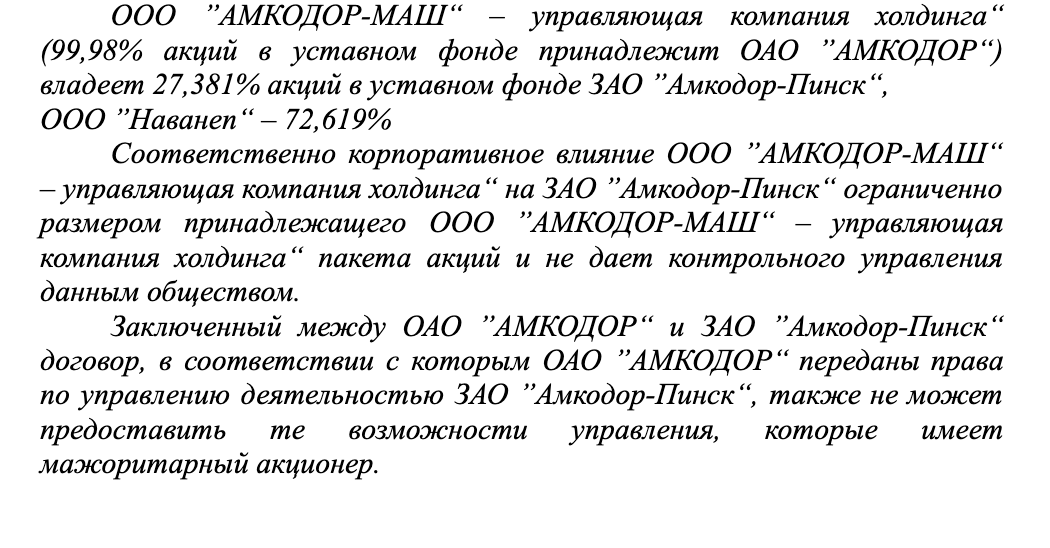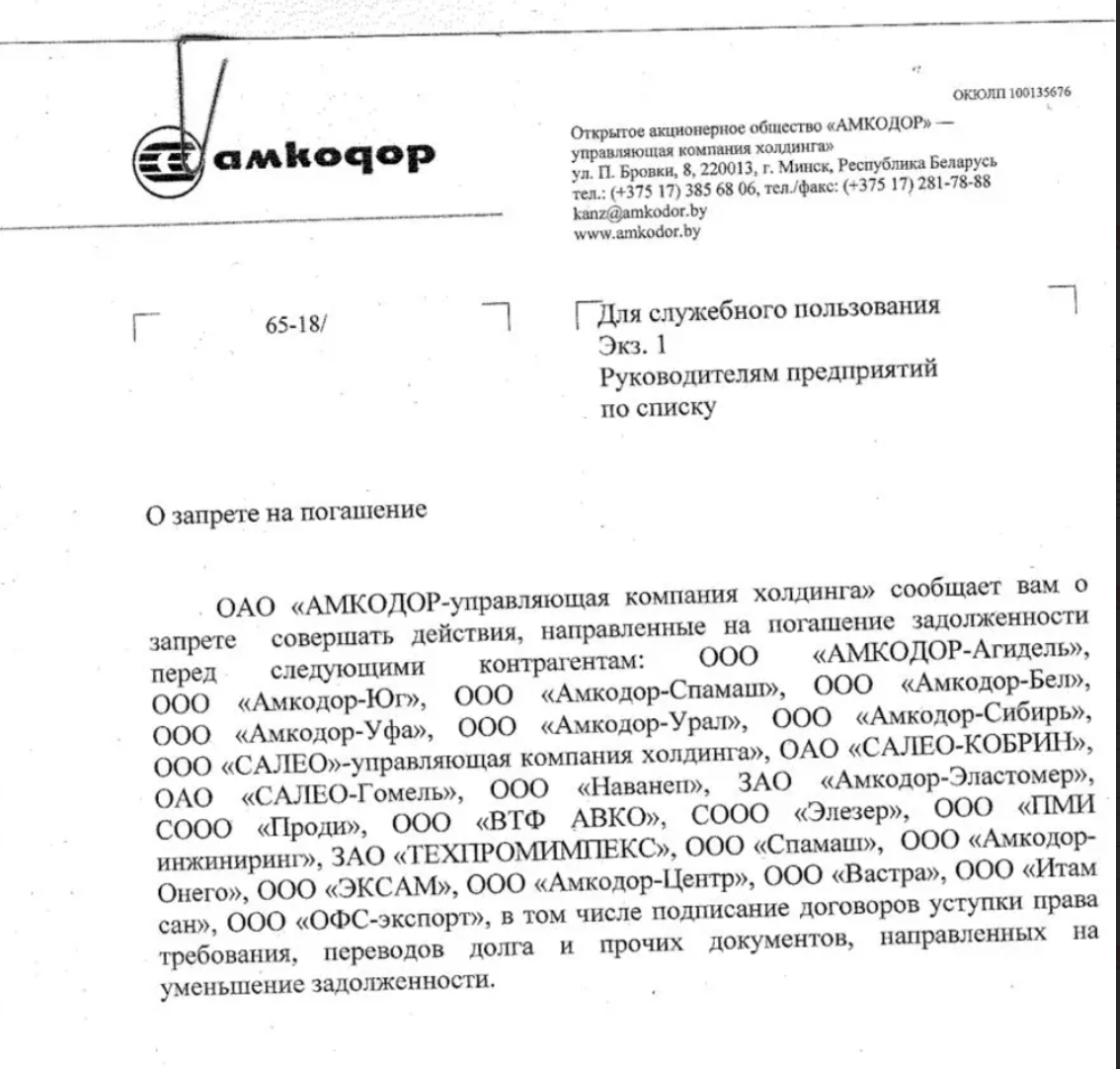 В конце октября генеральный директор государственного холдинга Александр Ефимов издал распоряжение, в котором запретил подчиненным предприятиям рассчитываться или возвращать долги 24 компаниям, принадлежащим или связанным с Шакутиным или его семьей. [*]  Через месяц, в ноябре, под контроль государства перешло ЗАО «Амкодор-Пинск» — об этом в телефонном разговоре нам сообщил заместитель директора этого предприятия. Акции «Амкодор-Пинск» не входили в число гарантий по возврату государственного займа, и 73% из них принадлежали семье Шакутина.