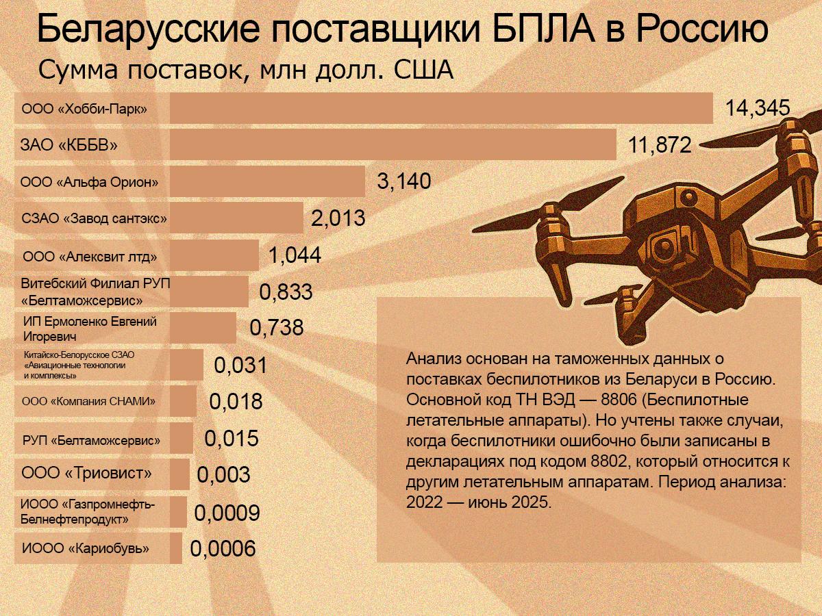 Производители беспилотников-квадрокоптеров, которые используют в таких «сафари на людей», запретили продажи в Россию и Украину. Однако эти дроны, наравне с аппаратами гражданского назначения, продолжают продавать в РФ — в том числе беларусские компании. В распоряжении БРЦ оказались сведения о поставках из Беларуси в Россию дронов разного типа за 2022 — июнь 2025 года. По нашим подсчетам, 14 беларусских компаний продали больше 20 тыс. БПЛА примерно на $34 млн. В этом расследовании мы расскажем о трех наиболее крупных поставщиках, клиентами которых были в том числе компании, связанные с российской военной промышленностью.