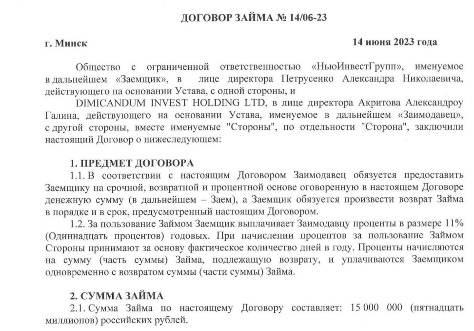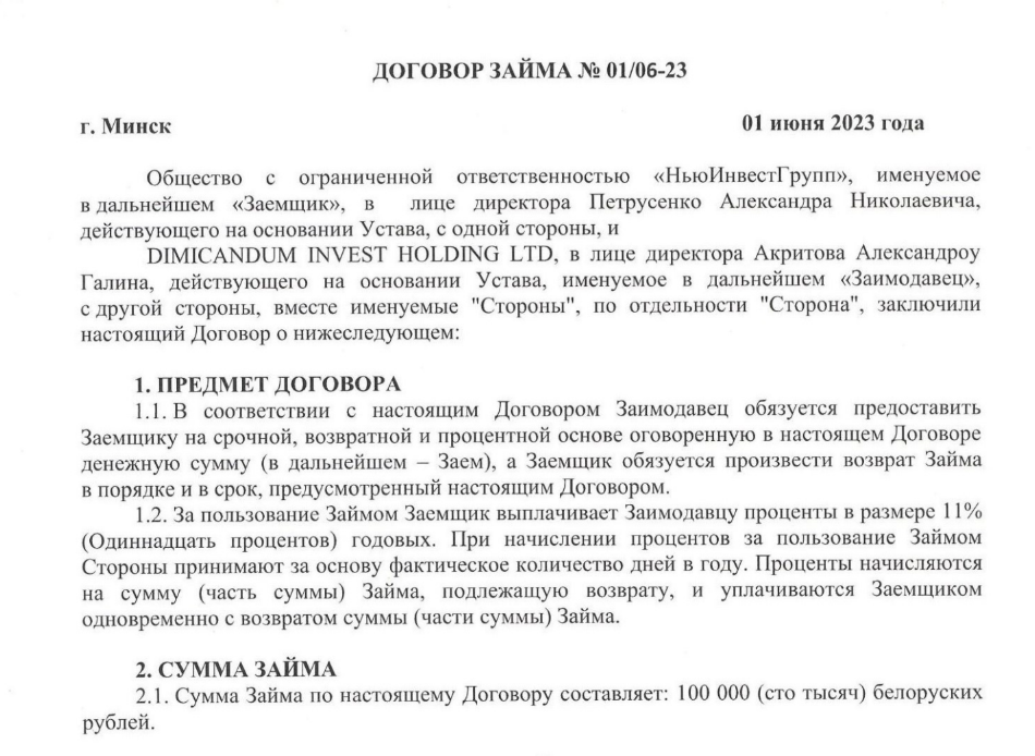 Участие перечисленных выше компаний в схеме обхода санкций неслучайно. Их связь подтверждают финансовые документы за 2023 год, которые мы получили благодаря «Рабочаму Руху». В июне кипрская Dimicandum заключила с «НьюИнвестГрупп» два договора займа. [*] [*] В том же месяце та оформила займ компании «Астрата». [*] Кроме того, название российской компании, частично принадлежащей Свиридову, совпадает с названием украинского ТОВ «Астрата», замешанного в деле о незаконном реэкспорте автомобилей, в котором фигурирует компания Rostumel. [*] [*]