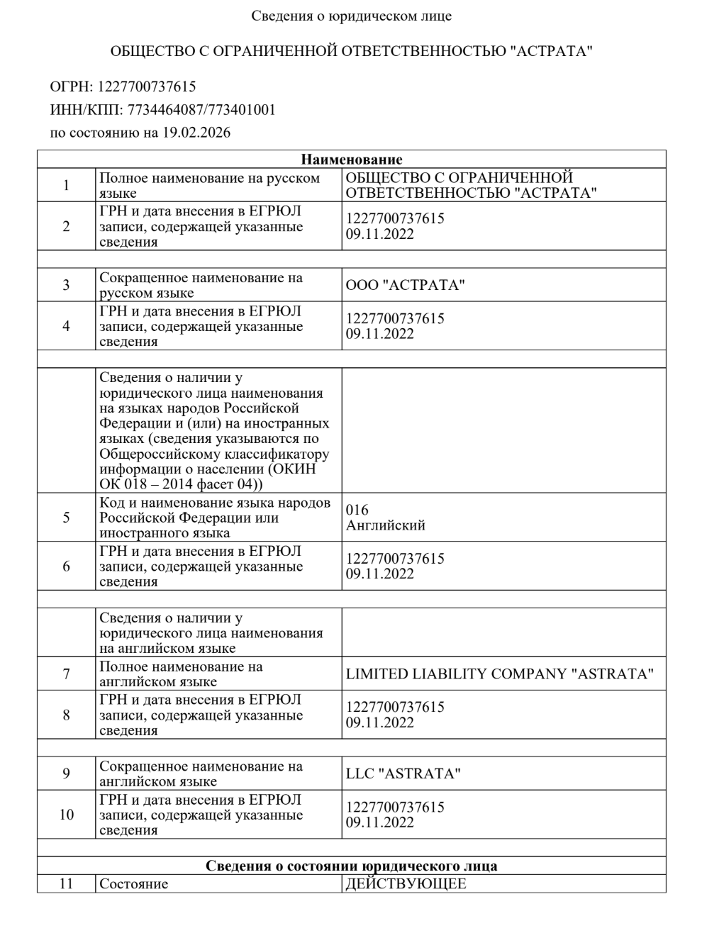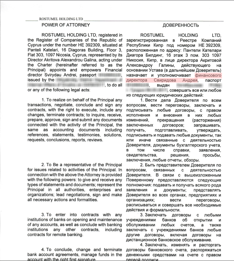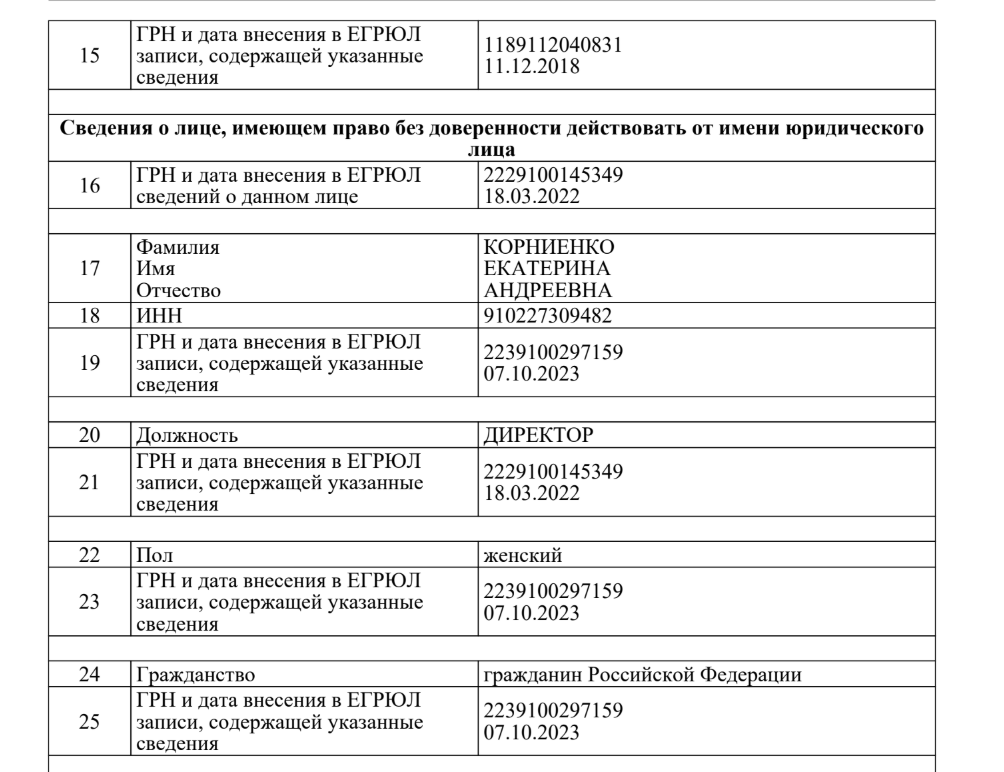Компания «Астрата» с 9 июля 2025 года на 80% принадлежит фигуранту нескольких наших расследований Андрею Свиридову. [*] [*] [*] Этот гражданин Беларуси с 2019 по 2021 годы был заместителем тогдашнего управляющего делами Александра Лукашенко — Виктора Шеймана. Оставшейся пятой частью «Астраты» на момент выхода материала владела крымчанка с российским паспортом Екатерина Корниенко. До середины 2025-го фирма ей принадлежала целиком. Связь Корниенко и Свиридова прослеживается и через другую компанию. С марта 2022 года Корниенко занимала должность директора ООО «ПИК», которым с апреля 2019-го по октябрь 2022-го владела кипрская компания Rostumel Holding Limited (далее — Rostumel). [*] [*] [*] В последней, как указано в доверенности, на июнь 2024-го финансовым директором числился Свиридов. [*]