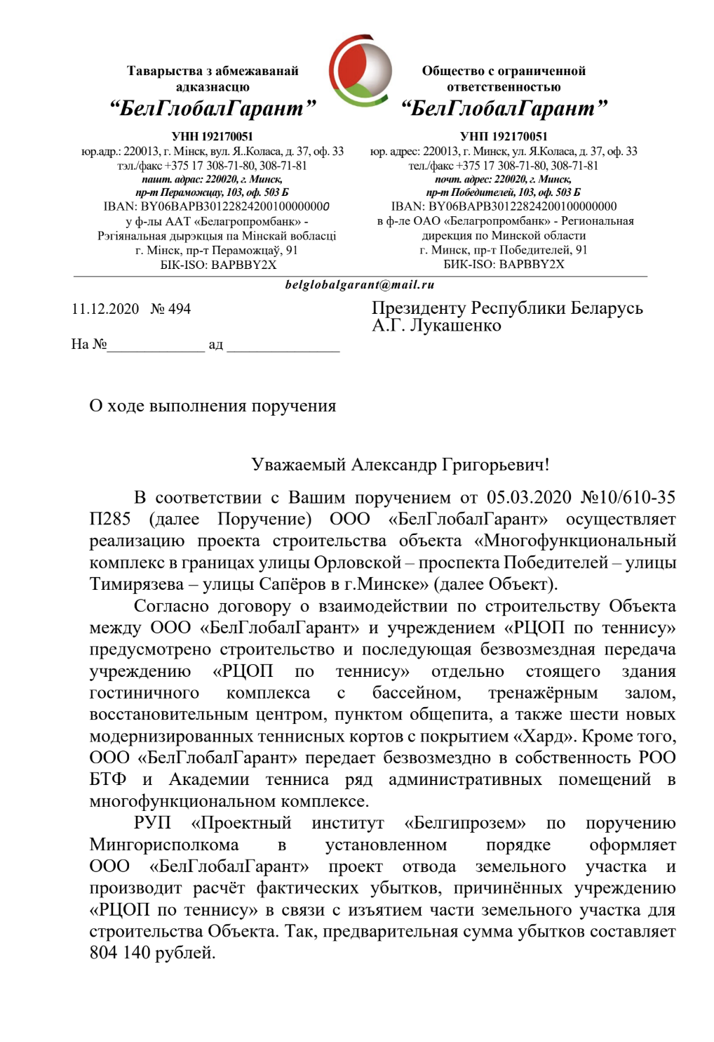 Напротив Дворца Независимости в Минске, главной рабочей резиденции Александра Лукашенко, находится Республиканский центр олимпийской подготовки по теннису (РЦОП по теннису). Ранее перед ним была наземная парковка, но в феврале 2021 года Мингорисполком решил передать землю, часть которой она занимала, инвестору под застройку. В общем город отдал 2,6 га. В договоре было предусмотрено строительство теннисных кортов, гостиницы для спортсменов и многофункционального комплекса. Стоимость строительства, по оценке в бизнес-плане инвестора, — $27,6 млн.