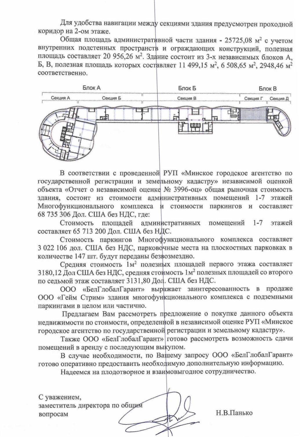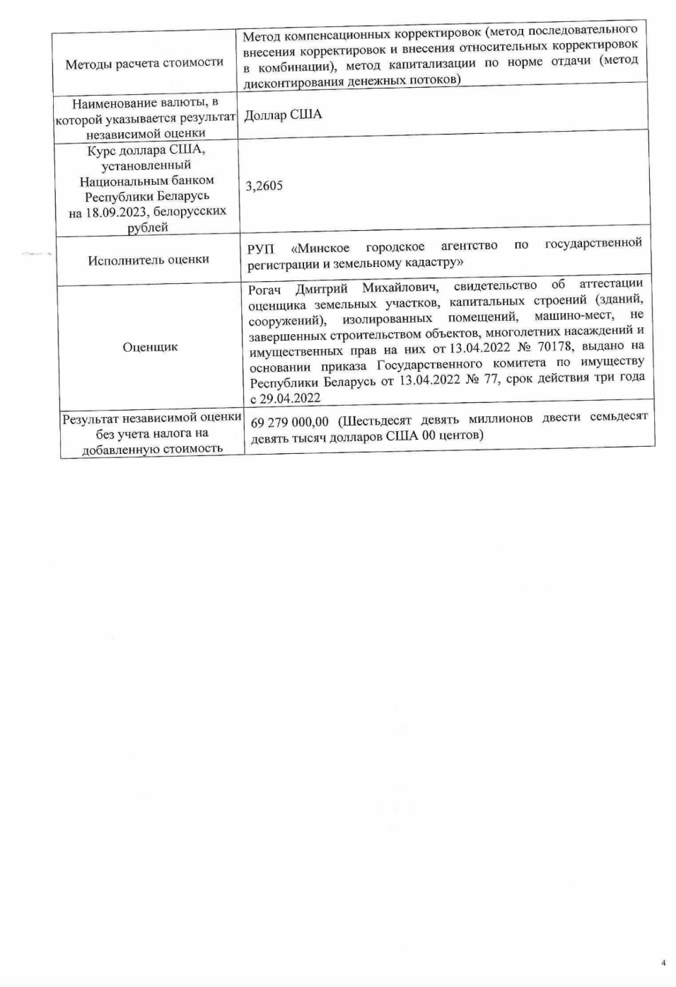В сентябре 2023 года компания «БелГлобалГарант» заказала независимую оценку будущего объекта недвижимости. Экспертизу провело РУП «Минское городское агентство по государственной регистрации и земельному кадастру». Результат оценки — $69,3 млн без учета налога на добавленную стоимость. [*] [*]