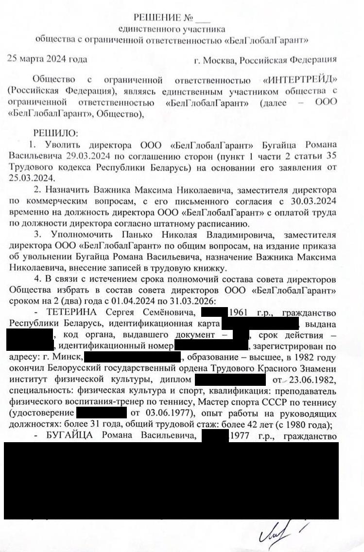 В июне 2021 года ЕС ввел против Тетерина персональные санкции, в обосновании его назвали представителем ближайшего окружения Лукашенко. За несколько недель до этого бизнесмен вышел из состава учредителей компании — таким образом «БелГлобалГарант» избежал европейских ограничений. [*] [*] Однако уже весной следующего года в компании создали новый орган управления — совет директоров. Почти сразу в нее вошел и сам Сергей Тетерин, сохранив влияние на деятельность фирмы. [*] [*] [*]