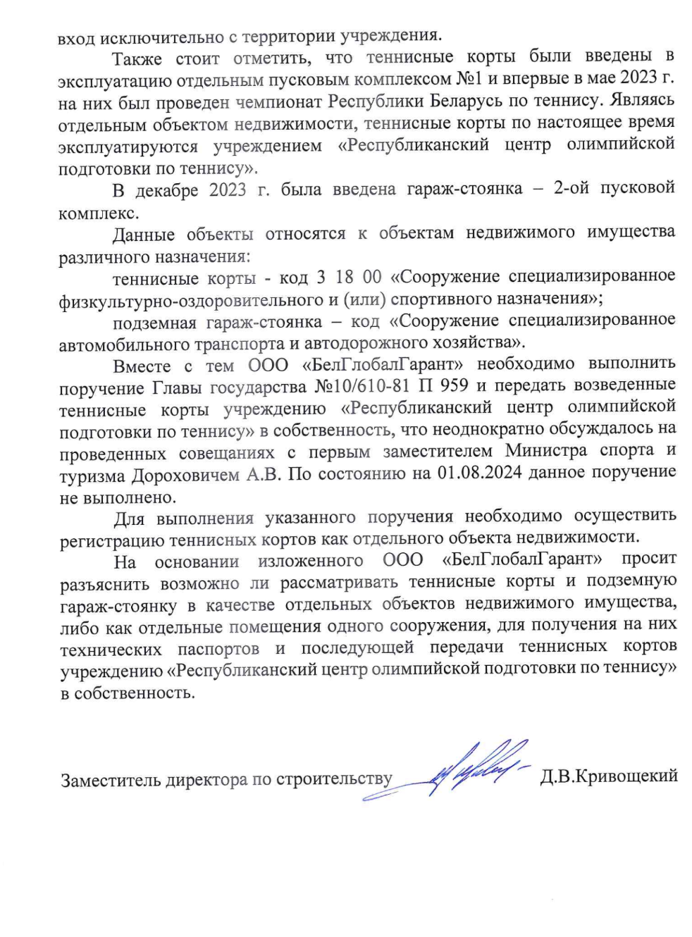В 2020 году «БелГлобалГарант» в сметах оценил объекты недвижимости, которые планировал передать на баланс РЦОП по теннису, в 9,5 млн беларусских рублей (около $3,5 млн), а их рыночную стоимость — не менее 14 млн рублей (около $5 млн). Однако фактические расходы компании были меньше, например, строительство теннисных кортов стоило около миллиона беларусских рублей. [*] [*] [*] [*] Согласно бизнес-плану, на гостиницу вместе с соответствующей инфраструктурой должны были потратить 5 млн беларусских рублей. Сколько стоило строительство отеля в итоге и было ли оно завершено, мы не знаем: в акте приемки в эксплуатацию объекта от 12 января 2024 года отеля нет. [*]