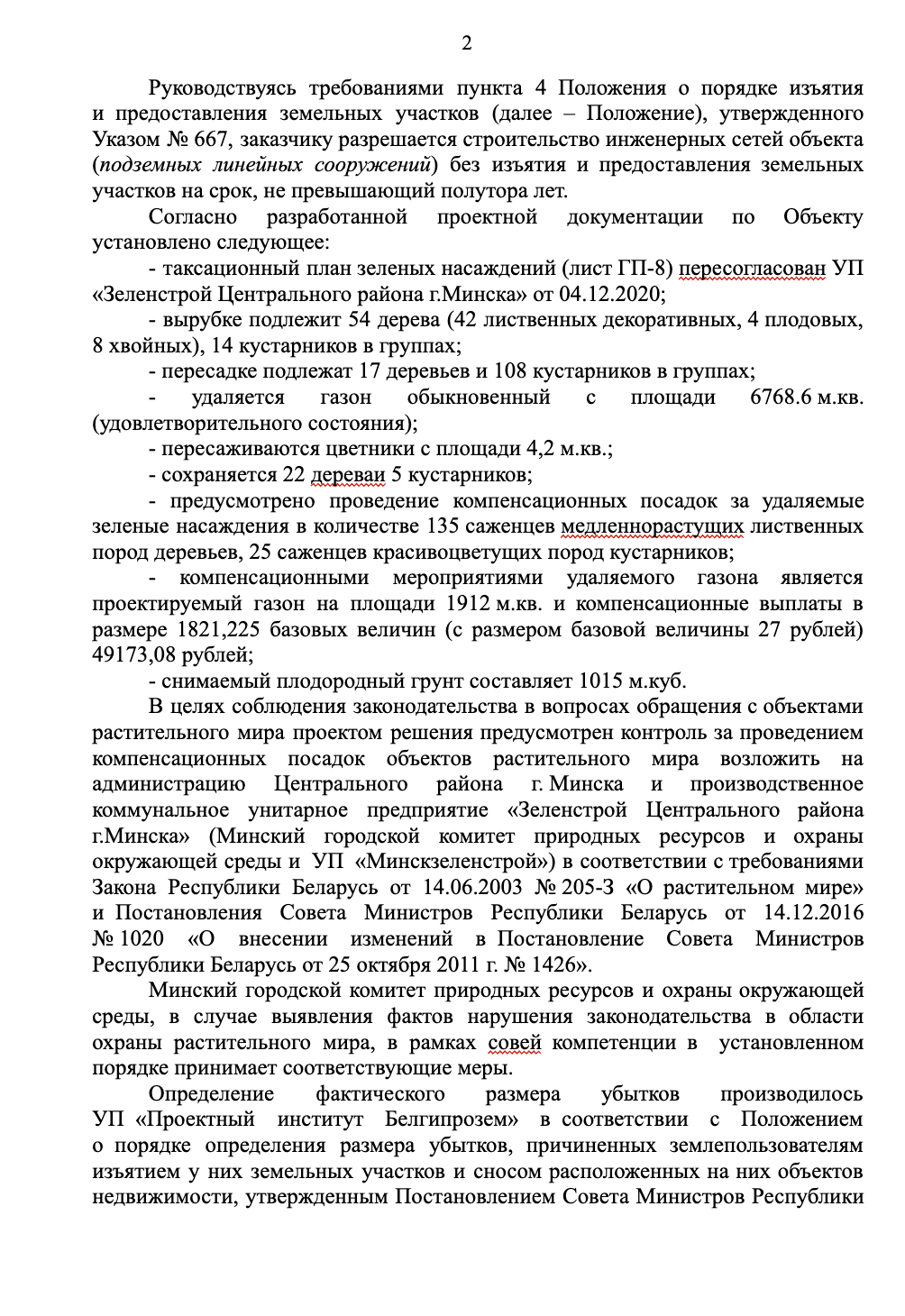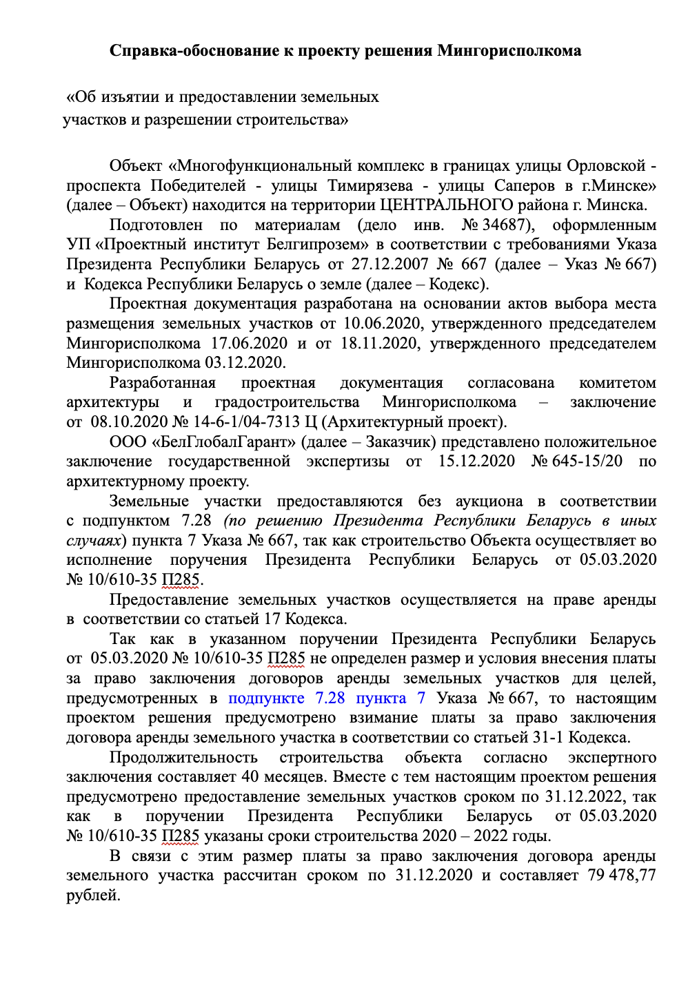 Согласно Указу Президента РБ от 2007 года, глава государства имеет право личным поручением передать участок инвестору напрямую. То есть нарушения в передаче права на аренду земли в данном случае нет. Сумма, за которую «БелГлобалГарант» получил право на аренду, — менее 1% кадастровой оценки, также соответствует действующему беларусскому законодательству, которое касается передачи земли без аукциона.