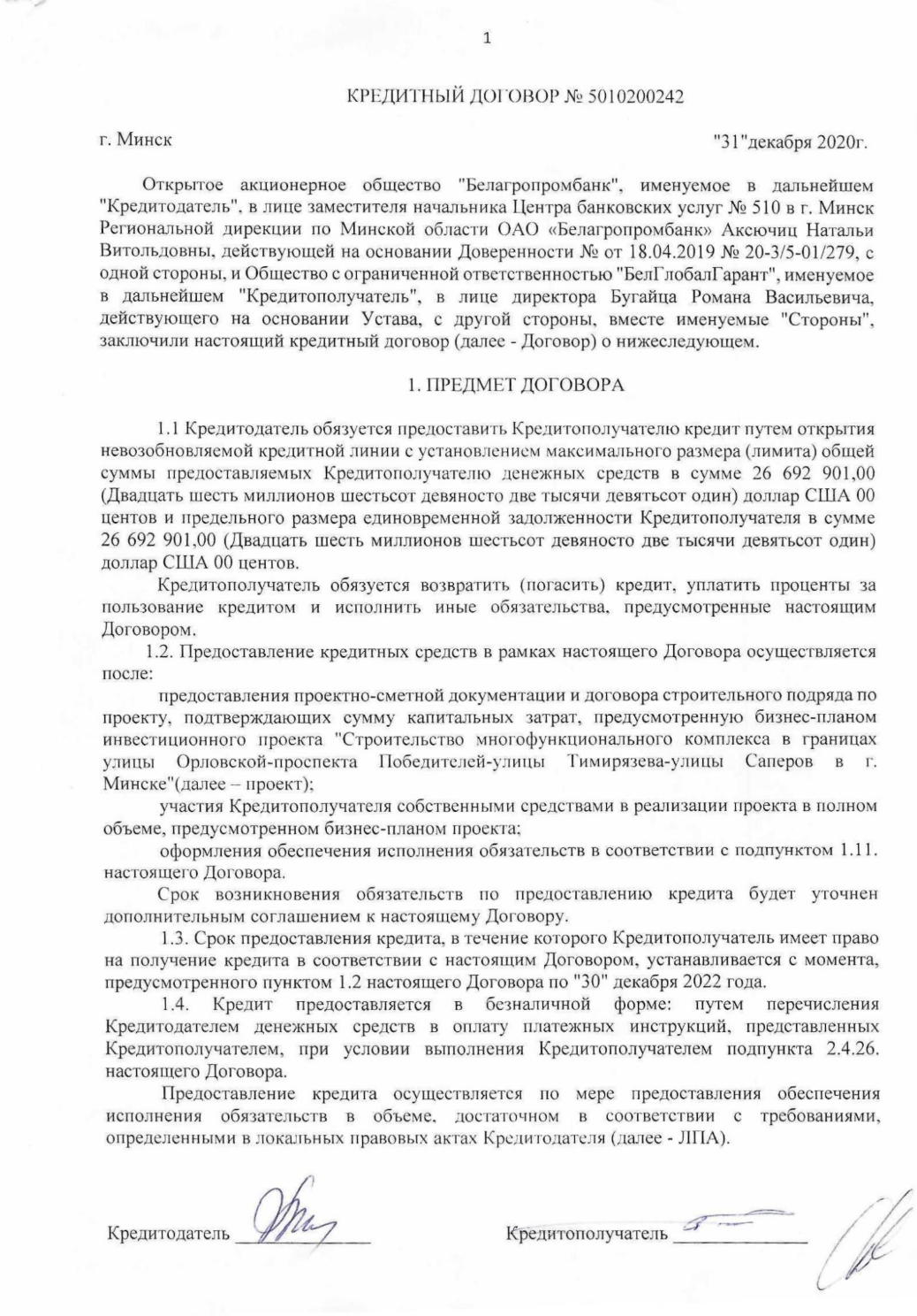 Согласно бизнес-плану, собственные расходы инвестора должны были покрыть лишь 3% общего объема затрат. В конце 2020 года государственный «Белагропромбанк» открыл для «БелГлобалГарант» кредитную линию на $26,7 млн. [*] Заем предоставили до 2033 года под 6% годовых. [*] В качестве залога «Белагропромбанк» получил имущественное право на будущий комплекс, стоимость которого в договоре оценили в $22,8 млн. [*]
