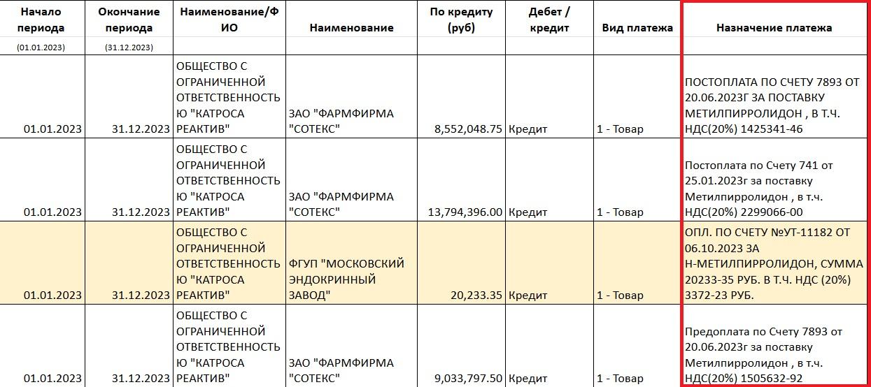 Каму расейская кампанія прадавала рэчыва, якое і фарбу растварае, і для вытворчасці хімзброі падыходзіць? «Катроса Реактив» у 2023-2024 гадах, паводле звестак банкаўскіх аперацыяў, паставіла NMP на $1,3 млн фармацэўтычнай кампаніі ЗАТ «Фармфірма “Сотекс”» і ФДУП «Маскоўскі эндакрынны завод». У дакументах пазначаныя толькі сумы ўгодаў без масы хімікату, таму мы не можам дакладна вызначыць, колькі тонаў рэчыва фактычна набылі фармкампаніі. [*]