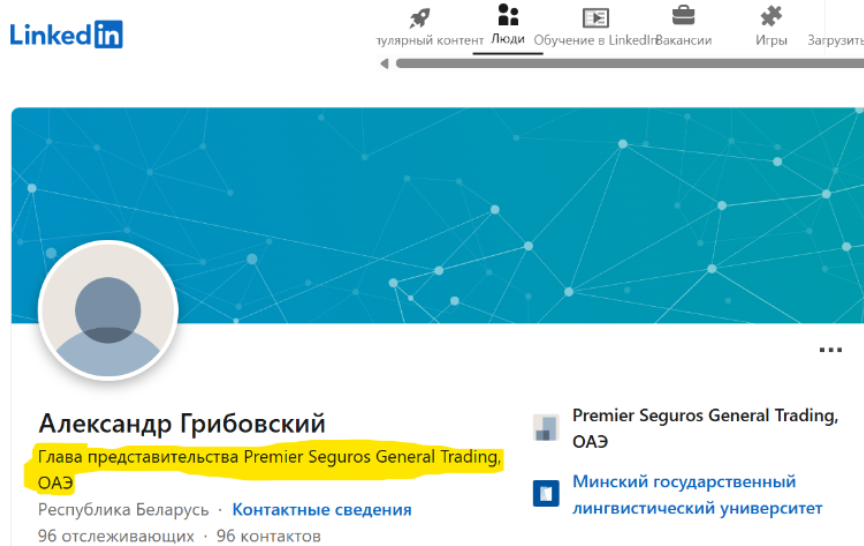 Грибовский работал и в Минске. Еще с 2010 года он управлял беларусским представительством эмиратской компании Premier Seguros General Trading LLC — той самой, через которую Аль-Сувайди вместе с «Белзарубежстроем» строил заводы в Венесуэле. В 2010 году Premier Seguros General Trading LLC (теперь PSGT Middle East General Trading) стало дистрибьюторам Минского автозавода (МАЗ) в Латинской Америке. [*]