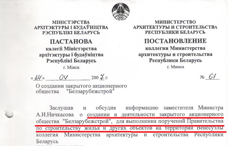 Первый контракт «Белзарубежстрой» получил в 2007 году после визита Лукашенко к Уго Чавесу: компания взялась строить жилой комплекс в Венесуэле. Позднее появились новые договоры: заводы для ремонта и сборки беларусской сельскохозяйственной техники и грузовиков и другие строительные подряды. Согласно слитым из Администрации президента документам, на 2012 год общий портфель контрактов «Белзарубежстроя» в Венесуэле превышал миллиард долларов. Для сравнения, последние опубликованные данные о товарообороте Беларуси с Венесуэлой — еще за 2021 год — едва достигают $2 млн, а во времена дружбы Лукашенко и Чавеса речь шла о суммах до полутора миллиардов.