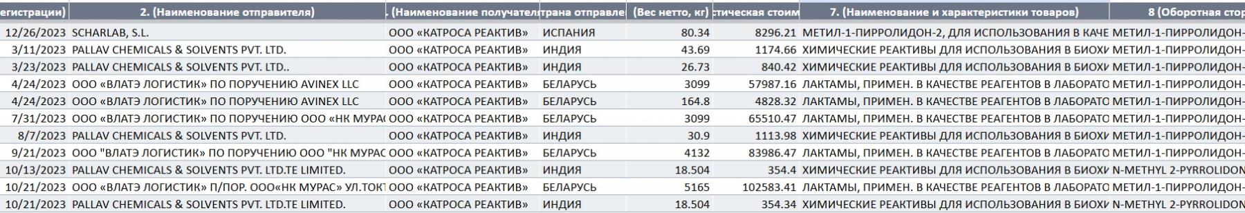 После введения запрета на экспорт NMP в Россию, в 2023 году, по данным российской таможни, «Катроса Реактив» купила около 16 тонн N-метил-2-пирролидона. В 2024 году — еще 21,3 тонны химического вещества под тем же товарным кодом, но без указания наименования товара. Из них 16 тонн пришло от Complexe Sancu SL. Оставшиеся 5 тонн растворителя доставило беларусское ООО «ВЛАТЕ Логистик». [*] [*]