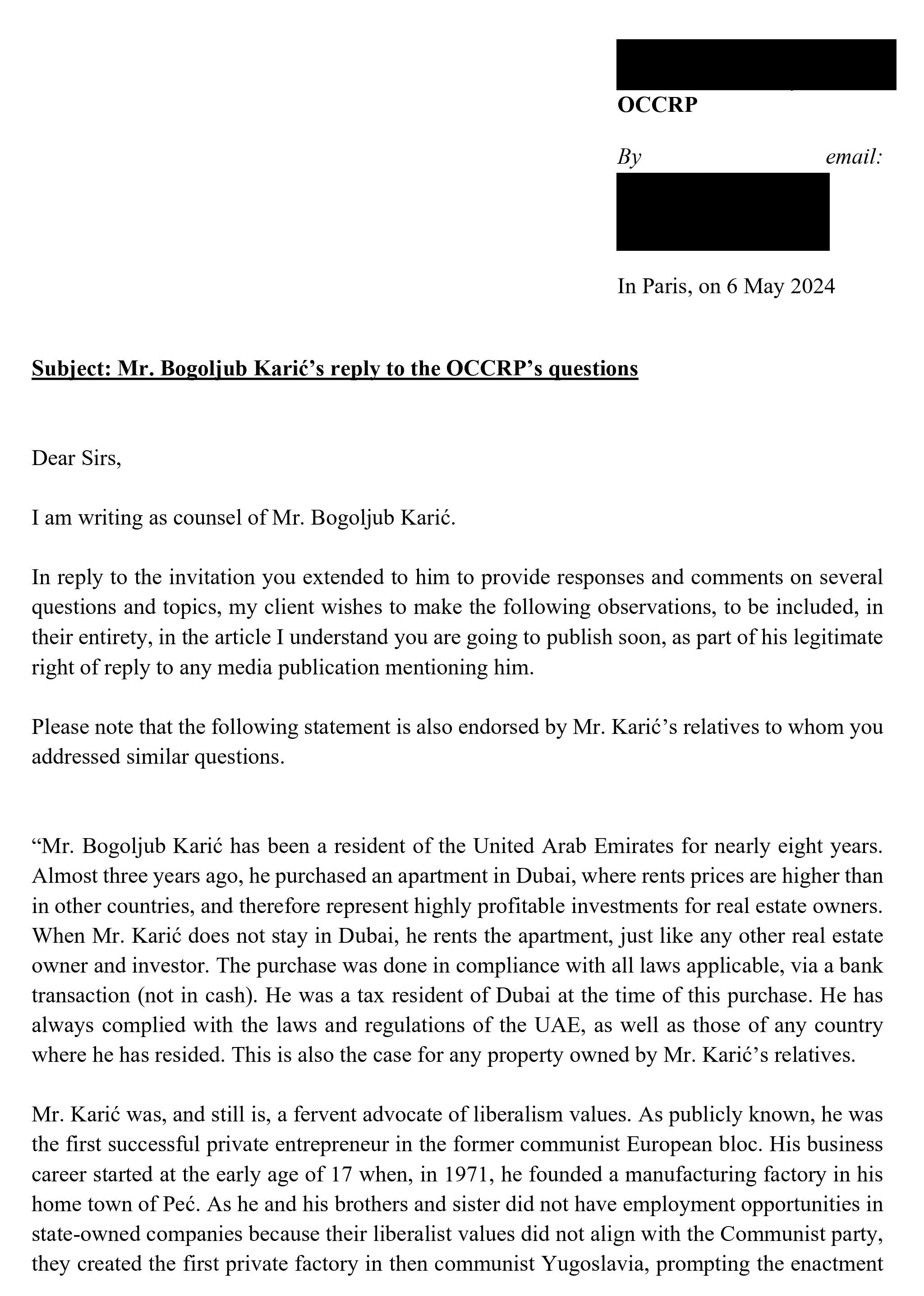 Нашыя партнёры па праекце Dubai Unlocked, журналісты OCCRP звярнуліся па каментар да Багалюба Карыча, але адказаў ягоны адвакат Уільям Жулі (William Julié). Той запэўніў, што Багалюб Карыч — законапаслухмяны грамадзянін і «прыхільнік каштоўнасцяў лібералізму». Таму ён спачатку развіваў бізнес у камуністычнай Югаславіі, а потым, па запрашэнні Гарбачова, прыехаў дзяліцца досведам у СССР. Са словаў адваката, з Аляксандрам Лукашэнкам Багалюб сустракаўся ўсяго адзін раз — у 2015 годзе. Цяпер бізнесовец на пенсіі, справамі больш не займаецца, як і ягоныя сваякі. Пад санкцыі ЕЗ Багалюб трапіў памылкова, сцвярджае Уільям Жулі, таму цяпер судзіцца за іх адмену.