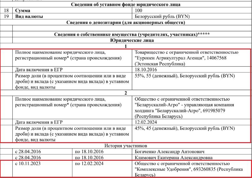 At the time of publication, Evropeyskoe Agrarnoe Agentstvo is owned by “Belaruskali Agro” — upravlyayushchaya kompaniya holdinga "Belaruskali-Agro" and the Estonian company European Agricultural Agency. A Belarusian businessman, Aliaksandr Bahachenka, has a stake in the Estonian company. [*]