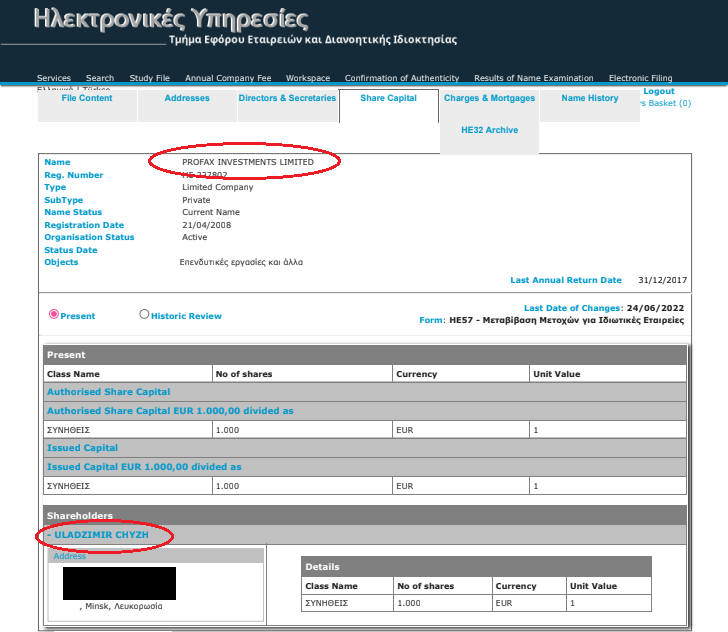Chyzh and Tomaševskij cooperated on a number of other projects in Belarus. According to an extract from the Belarusian Ministry of Justice, they still own JLLC NefteKhimTrading. Yury Chyzh as an individual, and Vitold Tomaševskij through the British company Globecast Limited.