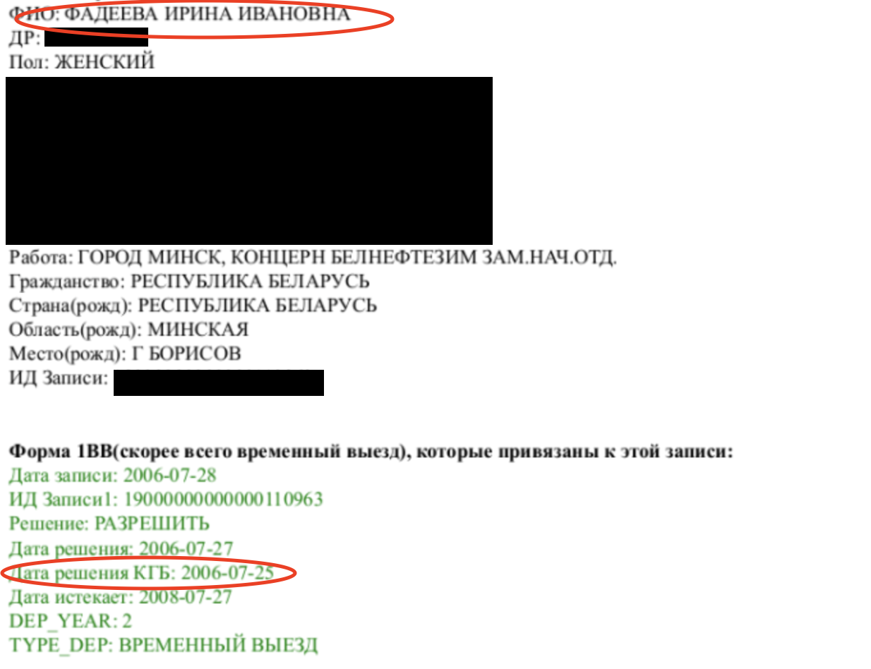 Фадеева – бывший сотрудник концерна «Белнефтехим», в который входит «Гродно Азот». С 2001 по 2008 годы КГБ выдавала ей специальное разрешение на выезд. Необходимость такого документа может указывать на имеющийся у неё доступ к секретной информации, связанной с национальной безопасностью. В разговоре с нами Фадеева рассказала, что как юрист помогла «Глобал Фертилайзер» с регистрацией, но не знает, чем занимается эта фирма.