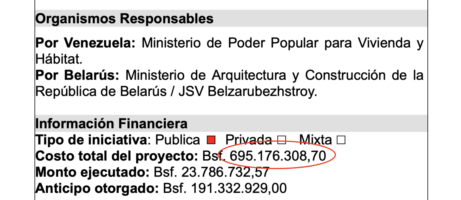 Ещё один неудачный проект, куда ввязалась Беларусь, – строительство жилья. Вскоре после того, как Минск и Каракас заключили нефтяной контракт, в Венесуэле из-за наводнения без крова остались тысячи семей. Чавес запустил программу строительства жилья. Беларуси это дело показалось перспективным, и она решила поучаствовать в нескольких проектах. Самым многообещающим казалось строительство 10 тысяч квартир на территории района «Фуэрте Тиуна» в Каракасе. Стоимость проекта оценивали в $750 млн.